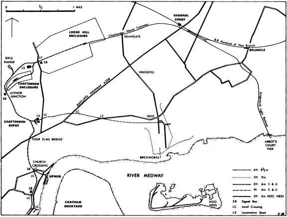 The magazines in the Chattenden enclosure were built between 1876 and 1878 by convict labour and the railway was, therefore, extended. The convicts were brought over daily in chains by boat from Chatham (originally they were housed in hulks on the Medway) and thence by the railway to Chattenden. Subsequently the line was straightened where it crossed Four Elms Hill by a level crossing and a bridge was built instead. In 1885 the line was extensively relaid and probably converted to 2ft 6in gauge where it was not already that gauge. (It is not known whether the Hoo line was ever relaid to 2ft 6in gauge - it is shown on the 1895 revision of the 6in Ordnance map as an "old tramway" - Hon. Eds.).