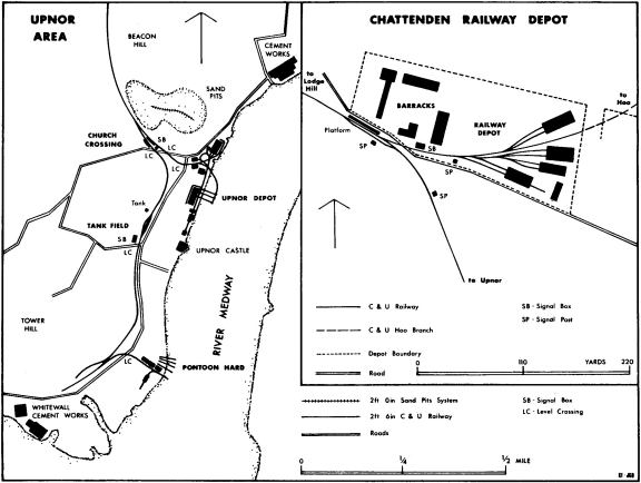 Chattenden Barracks (just behind the Railway Depot) was then the centre of the School of Military Engineering. By 1875 work had progressed so well that there were some four miles of track from Pontoon Hard, via Tank Field and Church Crossing to the Railway Depot with a spur line going from the crossing towards Lower Upnor, as well as a one and a half mile line from Chattenden to Hoo Creek.