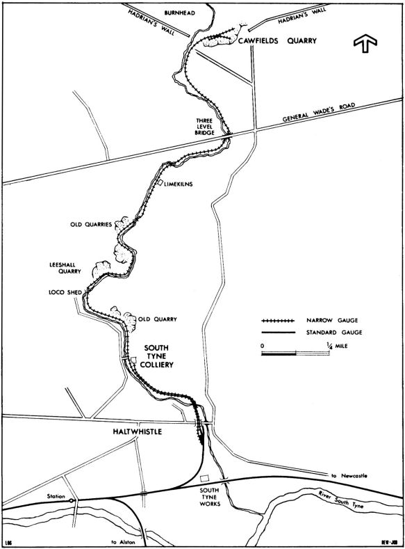 The Newcastle Granite & Whinstone Company went into liquidation in 1930; the Alston Limestone Co. Ltd. then took over the quarry, giving way in turn to the Mining & Quarry Engineering Co. Ltd., and finally the Amalgamated Roadstone Corporation Ltd. took over in 1946. The use of the railway had been discontinued about 1938 or 1939, when the tarring plant was moved to the quarry. Everything then went out by road transport. The quarry was finally closed in October 1952 after pressure from those interested in the preservation of the Roman Wall. The quarry itself is now a large deep pool reputed to hold some very large trout. A certain amount of very fine dressing still remains and is gradually being carted away. The spot where the line ran under the road has now disappeared as the level of the road has been raised to reduce steep hills on each side of the valley. From here the route down to Haltwhistle is a most enjoyable walk along the side of the burn and through the woods past the site of the colliery and a second engine shed down to where the tarring plant and dock lay beside the colliery screens and sidings. All signs of these structures have now disappeared with the building of a new road into Haltwhistle.