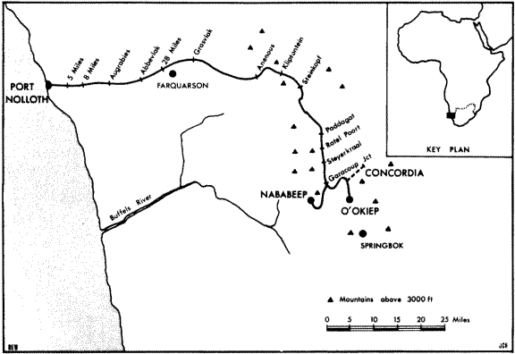 It all started in 1850 when Phillips & King of Cape Town bought mineral rights near Springbok. In no time at all plenty of small mines had been started, but only two companies survived for any length of time - Phillips & King, and the Concordia Copper Mining Company. Copper ore from the mines was precariously loaded into ships lying offshore along the wind swept coast and despatched overseas for smelting. Transport to the coast with mules and ox−wagons was a tedious business, with a drop of three thousand feet from the mines to the sea, through mountain passes and heavy sand dunes. By 1860 Phillips & King realised that if output continued to increase more equipment and resources would be needed. A prospectus was therefore issued to form the Cape of Good Hope Copper Co Ltd to take over and develop the partnership's mines and to build a railway inland from a jetty to be constructed at Port Nolloth. The immediate objective was to cross the sand dunes as more trouble was encountered crossing their twenty miles or so with heavy load, than in negotiating the eighty miles of mountains.
