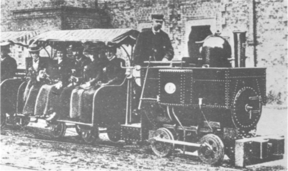 Two years after construction of the line had started, the first of the narrow gauge locomotives was delivered. This was a small Sharp Stewart 0−4−0 saddle tank costing £445, with inside cylinders (unusual for a narrow gauge locomotive) and numbered 1 in the narrow gauge locomotive stock. It weighed only about two tons and proved to be inadequate for the work. One problem encountered with it was maintenance of the motion, which, being very near the ground, was inaccessible whilst the locomotive was on the road. Later, as more engines appeared on the scene, No.1 was used only for hauling the visitors’ special passenger train, and it was eventually withdrawn from service in 1913.