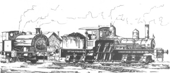 Perhaps it was nothing like that at all, but it pleases me to think it was. The Shay would be certain to attract attention with its novel method of operation and its lop-sided aspect (the boiler being offset to the left to accommodate the engine unit on the right hand side). Like all Shays, it would have had three cylinders mounted vertically; power being transmitted via a crankshaft through a flexible lineshaft to bevel gears on the power bogies, both of which had great freedom of movement. Also of interest is that while the left hand cylinder had its steam chest mounted to the left, the other two had theirs to the right. To see this engine on the move with its distinctive motion and rapid exhaust, must have been enthralling to English eyes.