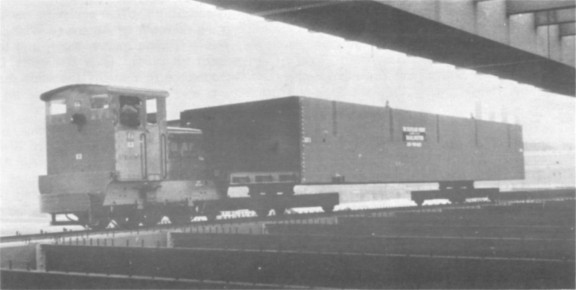 The principle components of the viaduct were the main longitudinal box girders, each 50 ft. long and weighing 25 tons, which in some cases arrived at the site with the rails for the contractor’s railway already in position on them. These girders were carried out to the erection point on two specially built bogies, which were simple steel trolleys 12ft long and 6ft 6in wide with four double flanged wheels and a single central bolster that could swivel to accommodate curves in the track. Each bogie was designed to carry 15 tons and ran on 5ft 2½in gauge track. The locomotive though was 3ft gauge, the broader gauge being used in order to ensure stability when moving a load in a high wind; the track therefore was mixed gauge, the outer rail being common to both gauges.