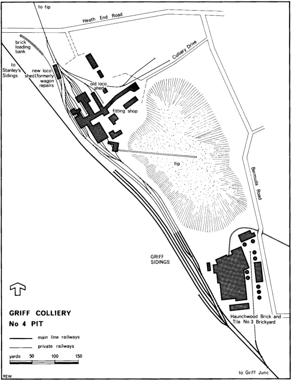 Griff Clara (No.1 and No.2 pits) and Griff No.4 were regarded as separate units even before the advent of the NCB, each having its own manager. This was certainly the case in the 1920's, when requirements were such that Clara employed some 1,100 underground workers with 250 on the surface; the totals for Griff No.4 were 850 and 150. No.4 pit was extensively rebuilt and brought up to modern standards in the late 1930's. The old steam winding engines were replaced with new electric units, an entirely new shaft was sunk, new screens were erected and the pit was extensively electrified. By the close of 1938 the pit was regarded as one of the most modern in the country. Without doubt it was the Griff Colliery Company's "showpiece".