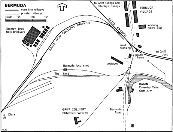 A description of the working of the ex LNWR Griff Branch may be of interest. Officially opened for traffic on 22nd June 1881 it had a long and interesting history. The Midland Railway, for example, could claim running powers over the branch and their locomotives commenced working in this manner on 11th September 1889 by a reciprocal arrangement whereby the LNWR - from the same date - were authorised to work over the MR Stockingford - Ansley Hall Colliery Branch. Access to the Griff Branch was controlled by Griff Junction signal box, and from here to Bermuda Level Crossing ground frame (½ mile) the branch was double track with an "up" and a "down" road. From the level crossing at Bermuda the Griff Branch proper became single track and continued on a rising gradient until Stanley's Sidings were reached. A trailing connection serving the basin at the head of the Griff Arm of the Coventry Canal left the branch immediately past the Bermuda crossing, and about 150 yards further on the branch serving Clara pit and Stanley Bros Ltd No.5 Brickyard diverged to the left. This short branch was known officially as Griff New Colliery Branch. Griff Sidings were adjacent to the Haunchwood Brick & Tile Co Ltd No.3 Brickyard at Bermuda. These were used for making up the trains which were despatched from the branch. Further sidings diverged from this point to serve the brickyard and No.4 pit. The BR branch foreman had his cabin at Griff Sidings and kept here the "staff" used in connection with the single line working to Stanley's Sidings at Stockingford. The Bermuda level crossing ground frame controlled access to the Griff New Colliery Branch, the siding to the canal basin and the access to the double track section which led to Griff Junction. This latter section boasted an "S" bend of rather severe curvature and BR drivers waiting to leave the branch with a fully loaded train (a maximum of fifty wagons) for the Coventry direction preferred to wait back at Bermuda crossing until they received the "right-away" from Griff Junction box. This was to enable them to take a run at the "S" bend "flat out", and by the time the train was passing over on to the "up" main line the permitted maximum speed for the branch (10mph) was often exceeded! The locomotives of trains bound for the Nuneaton direction propelled their stock off the branch "wrong road" on to the "down" main line at Griff Junction before setting forward for Nuneaton.