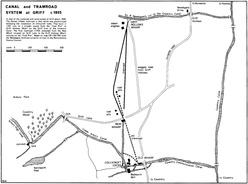 A map of the tramroad and canal system at Griff about 1805. The dotted (lifted) tramroad is that which was discontinued following the installation of Collycroft locks. That built in 7787 runs on a straight course from the "Coal Pits" to Griff Hollows Wharf on the Griff Arm of the Coventry Canal. The final tramroad (1793) extended from the New Wharf, situated on Griff Lane, to the Griff Hollows Wharf, running via the "Coal Pits". Based on map CR 136/758 from the Newdigate Archives currently on loan to the Warwickshire County Council.