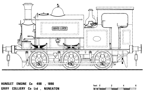 The first new locomotive to arrive at Griff was GOOD LUCK (Hunslet 498 of 1890), an inside cylinder 0-6-0 saddle tank with 13in by 18in cylinders and 3ft 1in diameter wheels. Its original livery was Victoria green, picked out with a 5/8in gold band edged with vermilion on the inside only, the distance line being Naples yellow; the frames were brown and the loco had a in dark green 'style' with a gold stripe on the panels only. A 'style' is an upright member in framing or panelling and is thought here to refer to a 3in band round the edges of the cab side sheets, and possibly the saddle tank sides also. GOOD LUCK was ex-works on 14th November 1890 and to some extent the name was synonymous with the locomotive's own fortunes for it was destined to have a lengthy stay at Griff, remaining one of the 'regulars' for over seventy years!