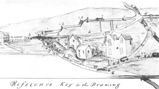 A contemporary artist's impression of the Griff tramroad wharf on the cut from the Coventry Canal to the Arbury Canal. Collycroft locks, which eventually superseded this tramroad system, are also visible. From drawing CR 136/M76A-76C of the Newdigate Archives, at present on loan to the County Record Office at Shire Hall, Warwick, of the Warwickshire County Council. |