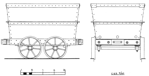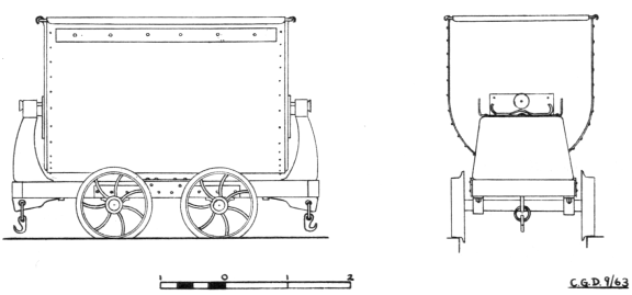 The drawing depicts a tub as originally built. The wheel diameter is 23" and the distance between centres 26". The wheel, which has seven straight spokes, is a force (and rust) fit on to the squared axle ends, and the total width of the wheel is 4". The axles fit into crude metal sockets. mounted on wooden underframes‚ and are lubricated with a thick black grease. Buckets of this grease and sticks for its application can be seen at various points along the line.) When built, the tubs operated on light section rail but, in this was replaced by heavier rail providing a 2" running surface, To this, the wheels were replaced by ones of 5" width with seven curved spokes, and the tubs now In regular service are so fitted. At the same time the wooden underframe was shortened to about 46" in length.