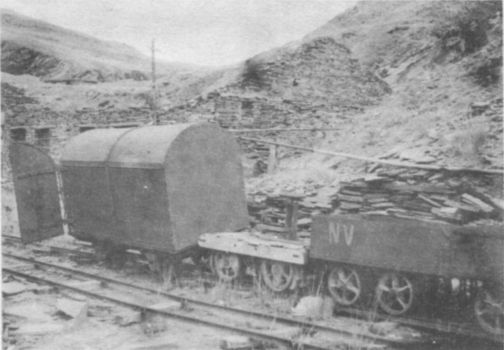Interest in 1962 was focussed on the abandoned 4ft gauge line and 1963 saw virtually the end of it. VELINHELI and the Hardy loco had been cut up by April with wheels, cab and frame only of the former present. These locos had been purchased by a scrap dealer in Caernarvon. Evans, but he had been persuaded to defer scrapping the other two 4ft gauge locos, DINORWIC and AMALTHAEA, until plans were made to preserve one. However, these fell through and, the management tiring of seeing the locos lying about. Evans cut them up in August immediately after the summer holiday. In June one transporter wagon and the saloon coach were in "Hardy's" shed. The track was being lifted – from the incline top to the works was just finished and a start was being made on the lines towards the far end. On the incline itself the track was in situ. The disposition of quarry locos in August was as follows: On the old platform were the dismantled remains of a loco, stated to be LADY MADCAP. On the ground level were RH 221605 on the near side of a long tunnel and VELINHELI and SYBIL on the far side. One level up on the same side of the tunnel as the latter was DOLBADARN. A disused level several levels up produced KING OF THE SCARLETS and MICHAEL (out of use) whilst several further levels up was a very long line with RH 277265 parked in the open and MAID MARION and BERNSTEIN (both in use) and ROUGH PUP (derelict) all in one shed. (This shed has a "false" back behind which was ROUGH PUP.) About three levels above was ALICE (disused) and several levels below her, but much further west in a different part of the quarry, HOLY WAR was in use.