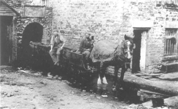 An example of the horse transport employed at the lead and barytes mines until after the 1939‑45 War period. The photograph, taken about 1930, shows Ralph and Tom Allison (the "level drawing" contractors) emerging from Wiregill Low Level with a train of wagons of lead ore destined for the dressing mill about 500 yards away. (collection H.L. Beadle)