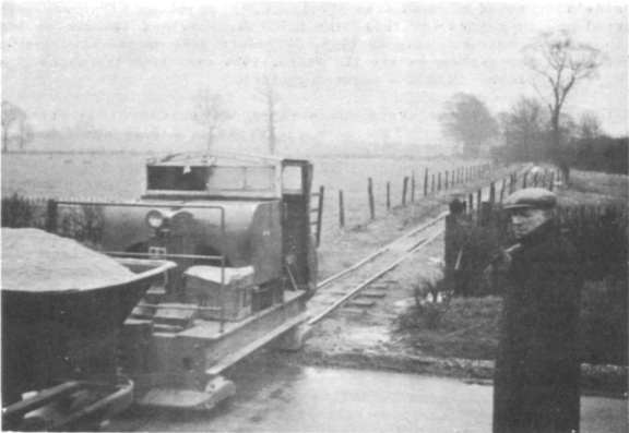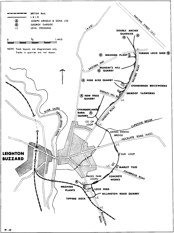 The line is some four to five miles in length and a train usually takes thirty to forty minutes for the complete journey, which includes crossing five public roads on the level. On leaving "Double Arches" a Garside’s train will cross the Clipstone Brook by a small timber bridge before joining Arnold’s track and immediately crossing Eastern Way. Here there is a man on crossing duty all day to flag the train across the road owing to the number of quarry locos that run without engine mates. After crossing Eastern Way, Garside’s old loco shed, now used for storing spare locos and for repairs, and a disused tipping dock are passed on the right. On the left, Miletree Road runs parallel to the line for about two miles, changing its name to Vandyke Road further along. After a short stretch of up and down, "Munday’s Hill Quarry" is passed on a rising gradient to the right. Immediately afterwards there is a pair of right-hand points at the top of Munday’s Hill, from which there is a very steep descent, particularly the upper section, as far as Stonehenge Brickworks. The pair of points mentioned above forms the entry to a long loop that runs the length of the steepest part. This loop is now virtually disused and overgrown with grass but in days gone by, two track running was the order up and down the gradient. At the brickworks a pair of right-hand points leads to the sand tip and there is another loop here. Immediately after this a line goes off to the right to Driroof Tiles. (It will now be apparent that all passing loops are on the right hand side in this direction.) After a gradual rise, Shenley Hill Road is reached and here, as at all other public road crossings, the trains must stop to allow the engine mate to flag the train over the road before rejoining it. After about another half-mile, in which there is another passing loop, a large curve to the left is reached known as the "Co−op Loop". Here the branch to "Chamberlain’s Barn Quarry" (and "New Trees Quarry") leaves the main line. There is also a short siding here which was once a passing loop judging by the name of the curve. Next the line crosses Vandyke Road and descends along the side of a field, soon to have a school built on it, to cross the Clipstone Brook again by a stone bridge with the curious nick-name of the "Swing-Swang". The line now rises again and after a very tight right-hand curve (that could not possibly have been so sharp when the steam locos were running), a short run across another field brings it to Hockliffe Road. After crossing the road there is another loop and beyond this, a short dead-end siding running into a field. This stops any runaways from crossing the busy Hockliffe Road. The points are spring-loaded and must be held closed when an empty train runs through. After rounding a right-hand curve, a formidable climb faces loaded trains. This is a quarter-mile bank which runs as far as Stanbridge Road passing loop. On this hill there is an occupation crossing between the Marley Tiles depots on either side of the line. This is where the locomotive exhaust whistles are needed. After getting about half way up, all trains stop to split into two portions; although the locos could probably pull right up on a dry rail it is considered wiser not to strain the engines. The wagons are left in the Stanbridge Road loop, the loco returning for the other half of the train. It is on this hill that any weak couplings are discovered, for wagons have been known to run back and form "a nice little pickle". The sidings into Marley Tiles used to leave the main line near the passing loop here, but these are now all removed. After crossing Stanbridge Road, the Leighton Buzzard Concrete Works, on the left-hand side, are served by a pair of facing points. Arnold’s, who supply a few wagons of sand each day, push the wagons in here after the loco has taken them from the back on the train at Hockliffe Road loop and pushes them up the hill. This is done so far away because otherwise, after splitting the train on the hill, the concrete works’ wagons would be in the middle of the train. After passing the concrete works the line passes under a recently constructed footbridge for the use of the R.A.F. personnel at a nearby camp. The line now rises as far as the next loop (now lifted), after which there is a gradual downhill run to Pages Park loop near Billington Road. Here the Garside’s loco runs round the train, another loco couples on in its place and the train runs across the road into Garside’s plant area, thus leaving the large loco at the right end for returning with the empties. Arnold’s loco will first uncouple and go across the road to the washing plant, pulling out, with another loco, washed sand and take it to the British Rail tipping dock. The two engines will then take the unwashed sand down to the plant, the large engine again being at the right end for the return journey. The run with the empties back to "Double Arches" usually takes about twenty-five minutes.
