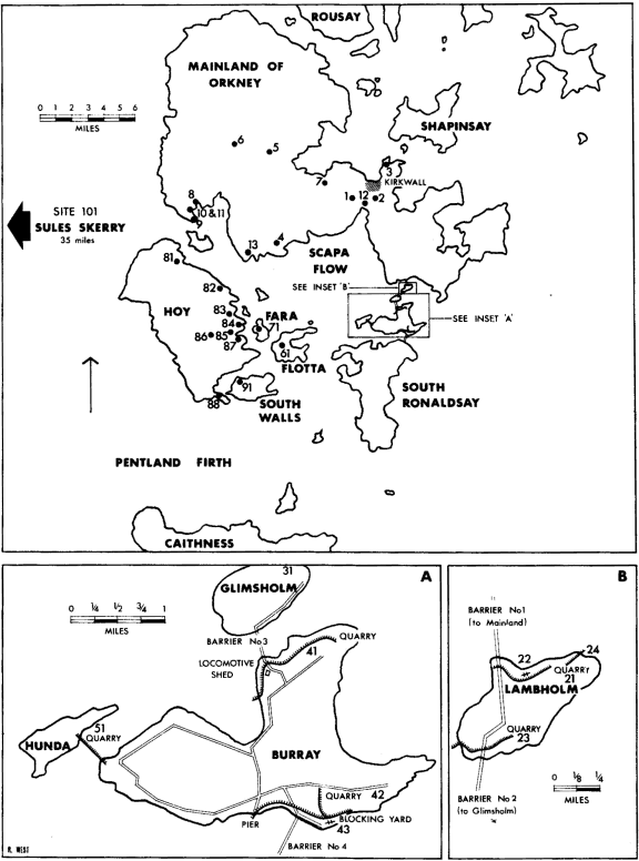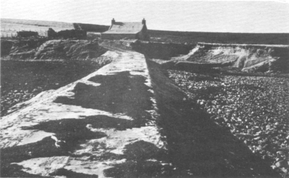 On the north side of the small island of Glimsholm there are traces of a 2ft system, leading from a small quarry on the west to the cableway, but No.3 Barrier was obviously built mainly from the Burray end. On the north side of the latter are the remains of a mile long system leading from a pier on the west, past a cliff face quarry and through a cutting (60ft long and up to 8ft deep), now affected by the sea, to the locomotive shed. From here the line continues past the cable and the remains, high up, of a camp, behind a farm to a quarry, and further up on to the island to a sandpit by a ruined broch (a Pictish dwelling shaped like a G.W.R. safety valve cover, with hollow walls). Here again confirmation of any standard gauge track is lacking, though it may have been to the west of the cable.