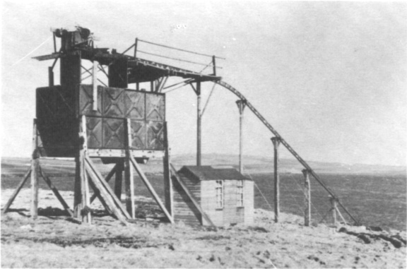One more rail system remains to be mentioned. That is the monorail of Alexander Sutherland (Contractors) on Lambholm, not far from the Italian Chapel, which lifts shingle from the beach to the hopper on the clifftop. It is quite standard with a Ford engine, mounted at the highest point, which hauls a car up. There are two cars extant, one lashed to the rail and the other lying beside it. It has one unusual feature in that tidal action is used to ensure a ready supply of shingle to the lower hopper.