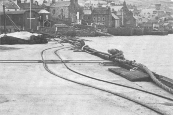 At Flotta, where once there was a huge camp and where the Services cinema is still used for dances, wedding receptions, etc., the two piers were connected by a 2ft system. Some of the track is still laid in the concrete.