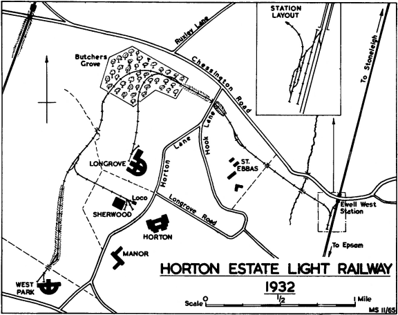 Early in 1907 HOLLYMOOR was sold (possibly direct to the Austin Motor Co. Ltd. in Birmingham), leaving CROSSNESS in sole command; the latter was fully occupied in carrying supplies for the equipping of the hospital which the L.C.C. took over in 1909. They also acquired the railway, intending to retain it for carrying coal to the boilers which heated the hospital. Accordingly, the rails were re−aligned to the east of the first site and an, under-bridge constructed at the Hook Road. The line was then entirely fenced off and a footbridge erected over the Epsom to Ewell bridle path. Soon after this the L.C.C. applied for permission to extend the railway to serve the Horton and Manor hospitals. The Board of Trade would agree to this only if the proposed lines were constructed in tunnel under the Horton Lane, and not, as was the original idea, crossing it on the level. Coupled with the difficulty of unloading coal on a sub−surface line, the extra expense was thought to be excessive, and the lines were never built.