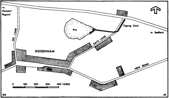 In Biddenham parish church is kept a scrapbook of the village, compiled by the Women’s Institute in 1956, wherein is a pencil sketch of a "train" arriving at the tipping bank about 1926. This sketch shows a horse drawing three loaded wagons with a man in attendance. There is also an office of some sort shown, which may have been a weighbridge office. About 1925 two children were involved in a fatal accident. Apparently it was their habit to visit the line on Sunday afternoons when it was not in use, and push a wagon up to the top of the bank and ride down on it to the bottom. Unfortunately the wagon on this occasion tipped up and pinned them underneath.