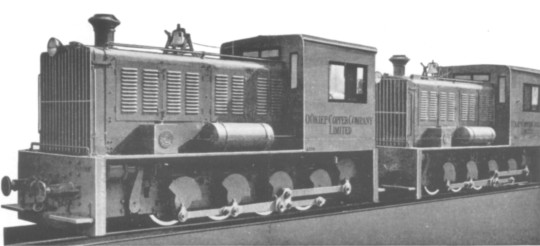 In reading thru this article in RECORD 18 I find I can add a little concerning the O’Okiep Copper Company locos mentioned on page 213. This firm bought two 250hp 2ft 6in gauge 0−8−0 diesel mechanical locos in February 1938 from the Vulcan Iron Works, USA, construction numbers 4237 and 4238. VIW records show them as later sold to the Newmont Mining Corporation which I understand is an American concern (Newmont itself had three 60 cm gauge diesels built post-war by VIW and numbered TSUMEB Nos. 6, 7 and 10.) The enclosed photograph (copied from an official brochure) shows that the O’Okiep running numbers - the same as the VIW construction numbers - are painted on the lower leading corner of the cab, the usual place on VIW locos unless instructions were given otherwise. Notice the solid construction, the steam loco stack (chimney), and the bell.