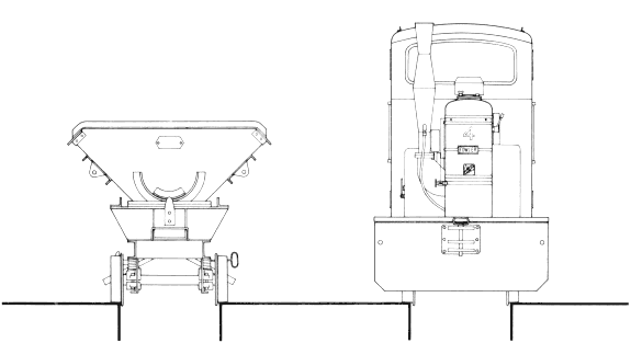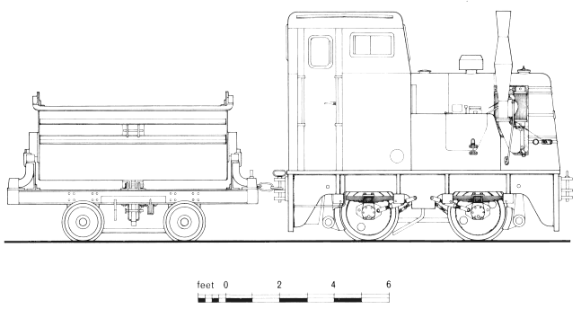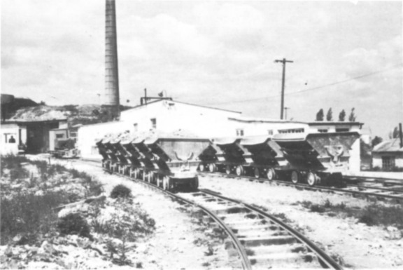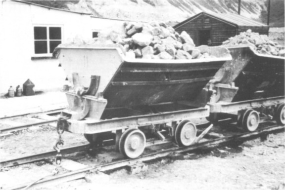 Two locomotives and three rakes of six wagons are needed for daily use. The wagons are propelled to the pit and hauled back. On arrival at the works the train is left in the loop while the locomotive uncouples and runs round to push the rake of empties, standing on the other track of the loop, back to the quarry. A steel cable is meanwhile attached to the full train which is then winched up a slight gradient and past the tip into the washmill. The train is then slowly run down past the tip and the wagons are tipped in turn, after which they run back to the loop to await the return to the quarry.