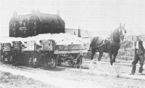 A train of chalk wagons on the Earl of Sheffield's tramway, in the charge of Mr H. Breeds. The Sheffield Arms Hotel is in the background. (collection A.J. Parsons)