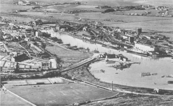 Newhaven Harbour, about 1930, looking upstream. The course of the tramway can just be discerned to the left of Sleeper's Hole, in the centre of the photograph. (collection H.A. Gamble)