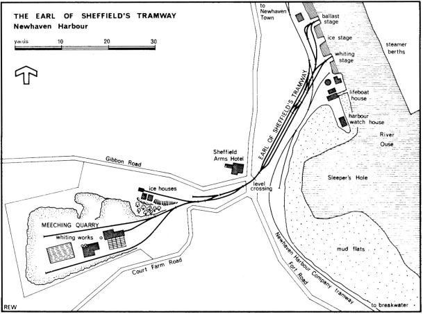 Eventually the Earl built such a tramway, half a mile long, from his chalk pit to three unloading stages on the river. The chalk carried down the tramway was discharged at these stages into sailing ships (after they had been unloaded at Newhaven) for use as ballast. The line itself, of standard gauge, consisted of rails spiked directly onto sleepers: where it crossed Fort Road a flag was displayed, but there were no gates nor was a crossing keeper employed.
