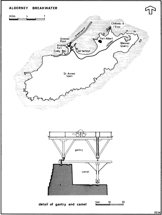 The vast increase in maritime trade during the early Victorian period was followed by a demand for harbours of refuge around Britain, and the Government proposed several schemes during 1846‑47. One was for a breakwater some 2,650 feet long from Grosnez Point, on the north side of Alderney in the Channel Islands, enclosing 67 acres of water. This was developed by successive Admiralty Boards during 1854‑58, the final proposal being a west breakwater 6,600 feet long and an east breakwater from Chateau a I'Etoc 1,700 feet long enclosing 150 acres. The cost was estimated at £2½ million pounds.