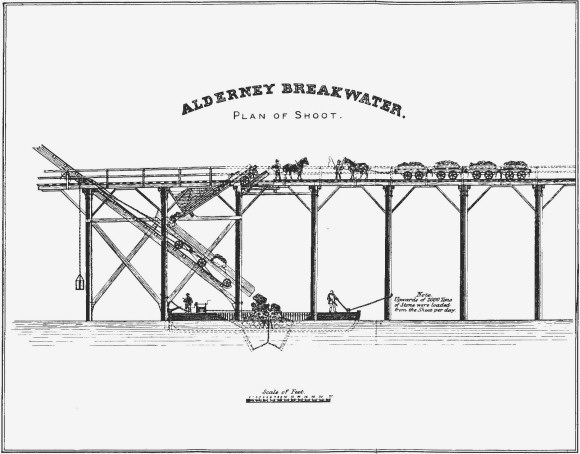 Rubble tipping was started probably in 1849, and by autumn of that year had reached 410 feet from the shore, all tipped from wagons on the end of the bank. Further direct tipping was impracticable and Walker, the Government Engineer, proposed that wagons be loaded on to barges, towed to the site and then tipped. (This method had been used previously at Plymouth.) Jackson proposed an alternative scheme using hopper barges loaded by an adjustable chute to accommodate changes in water level which varied by 17ft between tides. This was adopted, and the 60‑140 ton capacity barges, towed by steam tugs to the site, were able to drop their loads without stopping. By the late 1850's over half a million tons of stone a year were being dumped, at a rate of two to three thousand tons a day.