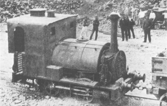 The Henry Hughes locomotive used by Thomas Jackson on Alderney, presumably photographed in Mannez Quarry in later days when used in connection with the maintenance of the breakwater. Note the small inverted vertical engine mounted on the side of the smokebox - possibly for obtaining the engine's water supply - and the (no doubt very necessary) enclosed cab. The original print shows what appears to be a cast brass rampant horse fixed above the lift‑up smokebox door, similar to those familiar on the road engine products of Aveling & Porter of Rochester - perhaps an example of applied decoration by the driver as there is no suggestion that Aveling's were responsible for the construction of the locomotive. (courtesy Ian Allan Ltd)