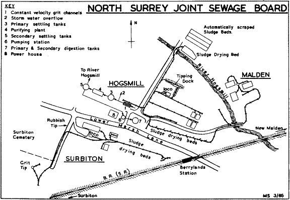 In between these two disposal works lay a large tract of land, and it was here that in 1931 the Hogsmill Valley Joint Sewage Board proposed to establish another sewage works. Due to local objections and the War, construction of the works was delayed, but began in 1953. In 1932 the cost of the works had been estimated at £340,000 but, when the works was officially opened on 7th October 1957, some £2,000,000 had been spent. Of the three works this is, of course, the most advanced, and a description of the process used to purify the sewage here may be of interest.